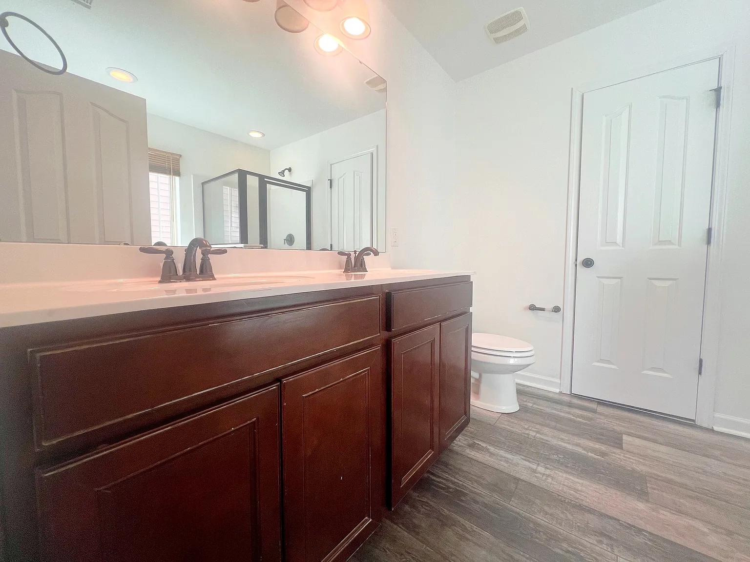 The master en suite is equipped with vanity and walk-in shower.