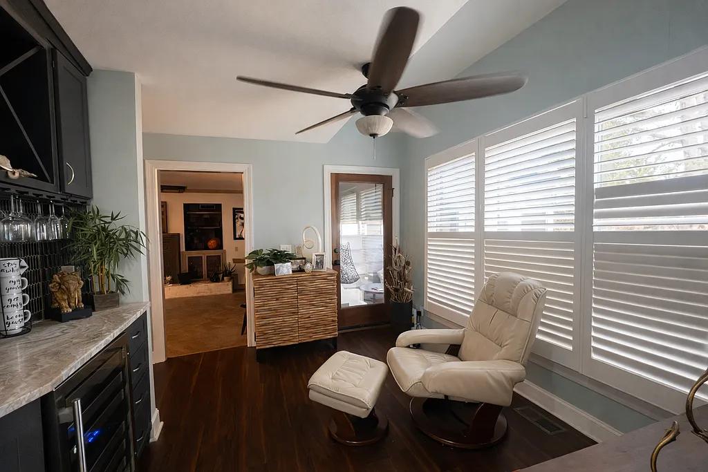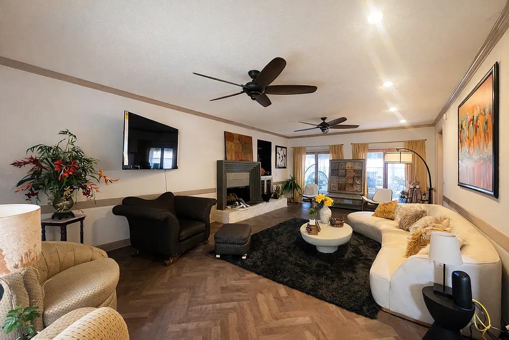 The large family room with fireplace creates a warm gathering space and features sliding double doors that open to a bright sunroom, bringing the outdoors in.