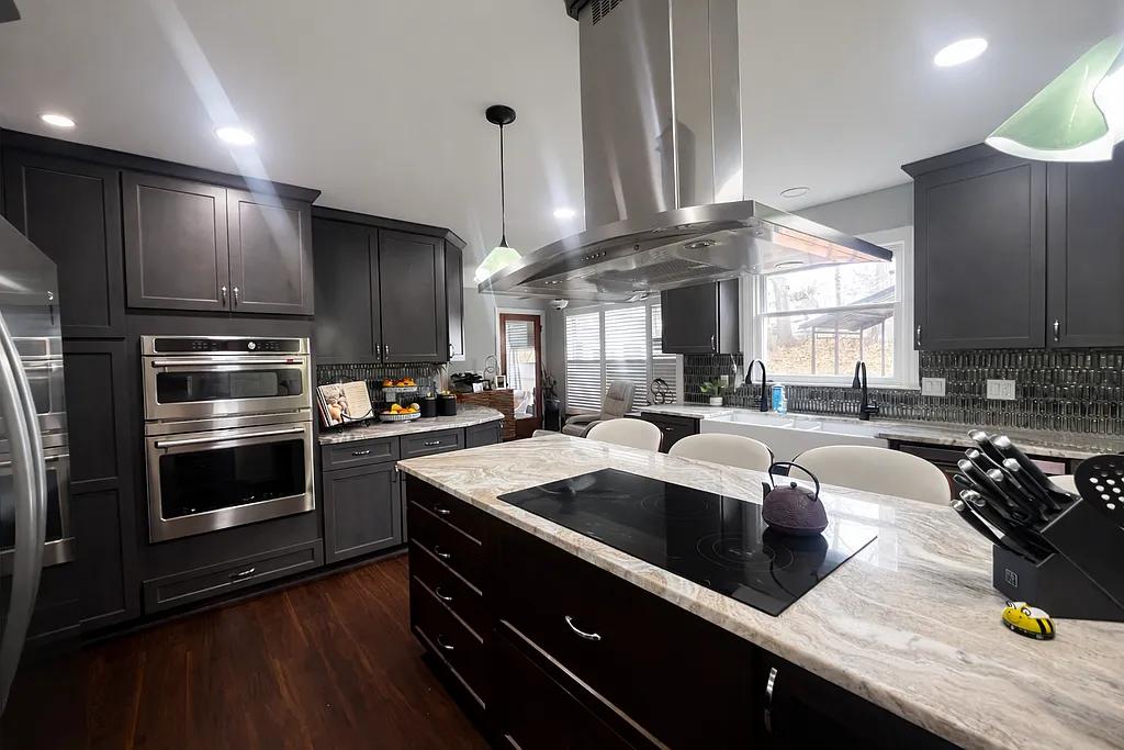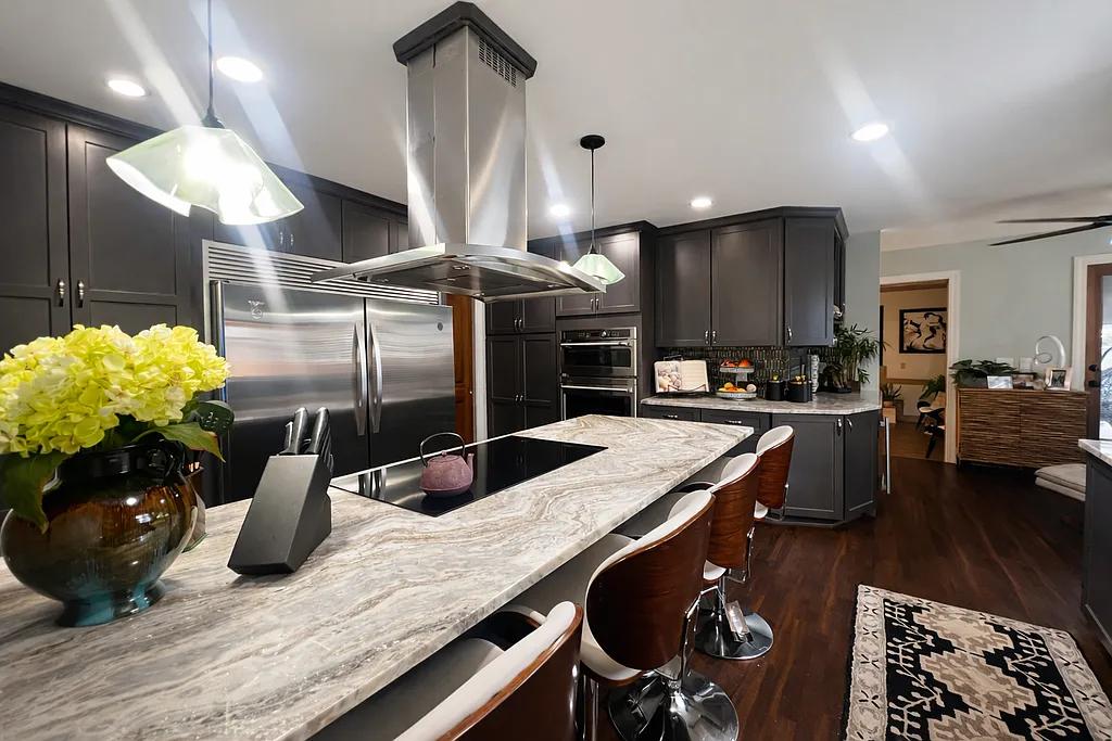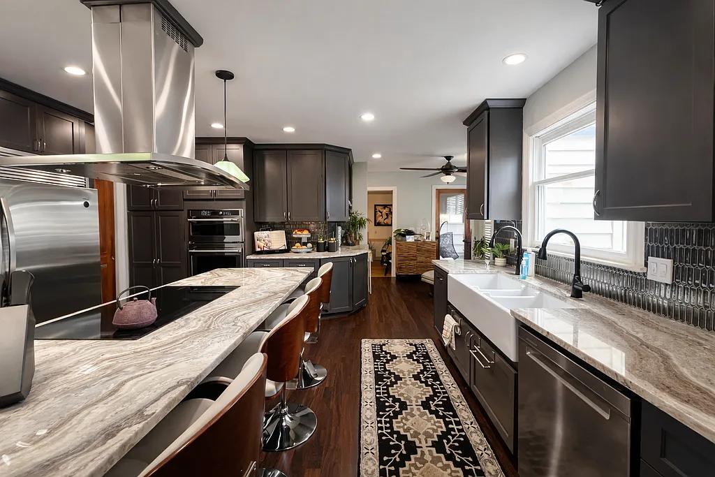 The gourmet kitchen is truly the heart of the home, completely updated with an abundance of cabinetry, extraordinary appliances, a dedicated wine area, a large center island with seating, and a cozy breakfast area.